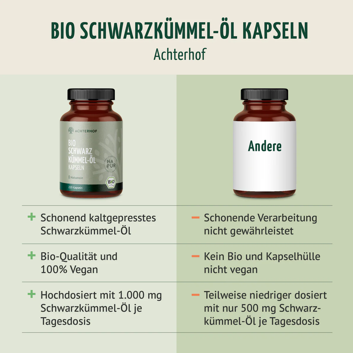 Die Schwarzkümmel-Öl Kapseln sind aus kontrolliert biologischen Anbau und garantieren durch eine schonende Kaltpressung des Öls beste Qualität, mit je 1.000 mg Schwarzkümmel-Öl pro Tagesdosis.