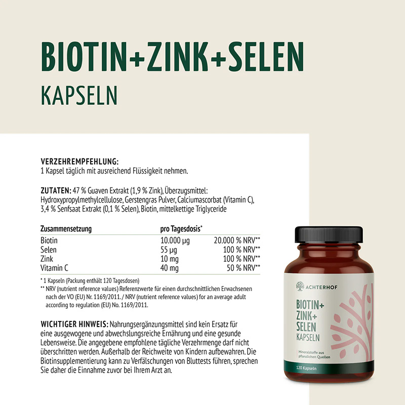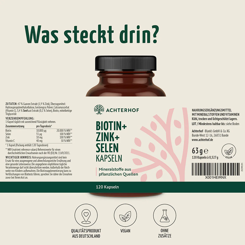 Der Biotin-Zink-Selen Komplex mit Zink aus Guaven Extrakt, Selen aus Senfsaat Extrakt, Vitamin C und Brennnesselsamenpulver. Die ideale Kombination aus bioverfügbaren Inhaltsstoffen für Haut, Haare und Nägel. Die Mineralstoffe Zink und Selen sind hierbei aus rein pflanzlichen Quellen.