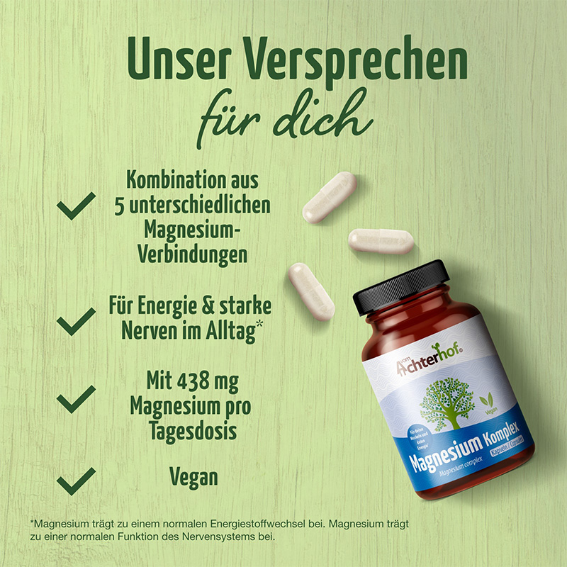 Der hochkonzentrierte Magnesium Komplex wiegt 800 mg je Kapsel , davon sind 438 mg reines Magnesium pro Tagesdosis auf Grund seiner Zusammensetzung aus 5 elementaren Magnesium Komponenten besonders gut verfügbar. Für ausreichend Energie und starke Nerven im Alltag*.