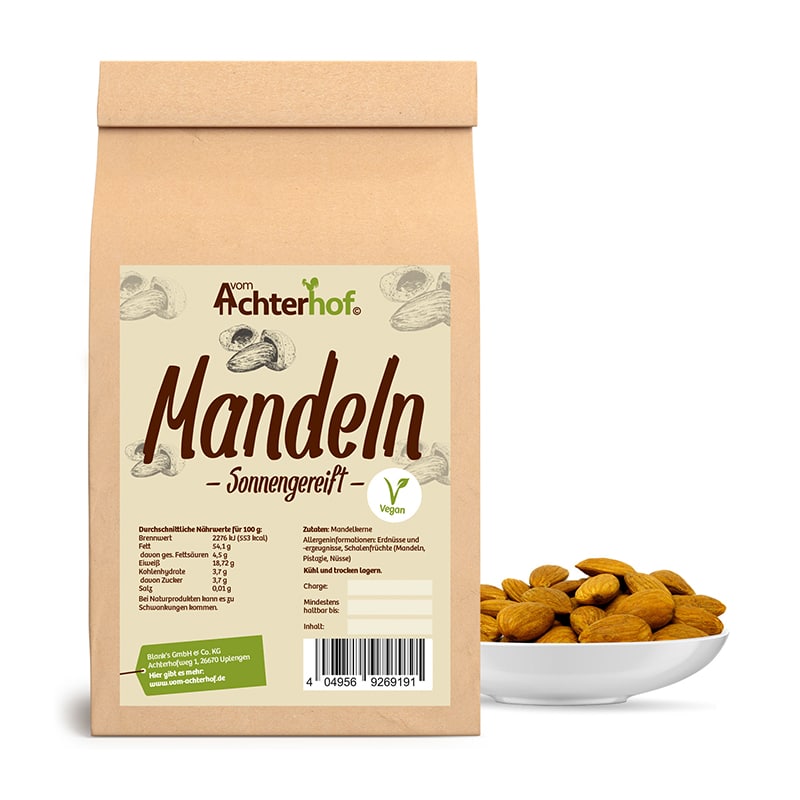 Ob als Bestandteil der Weihnachtsbäckerei, als feine Knabberei für zwischendurch oder sogar in der Kosmetikindustrie. Mandeln sind edel und unglaublich wandelbar. Und sie haben Tradition. Wusstest du, dass die Römer nicht Reis, sondern Mandeln auf das frisch vermählte Brautpaar warfen? Mandeln werden seit Jahrhunderten als Glücksbringer verstanden. Und du bist ein echter Glückspilz, wenn du unsere hochwertigen Mandeln kaufen möchtest. Der süße, angenehm milde Geschmack wird dir auf der Zunge zergehen und dich überzeugen. Die unzähligen Einsatzmöglichkeiten ebenso. Mandeln kaufen kannst du gleich hier im Shop. Bequem von zu Hause aus. Hol dir den leckeren Snack!